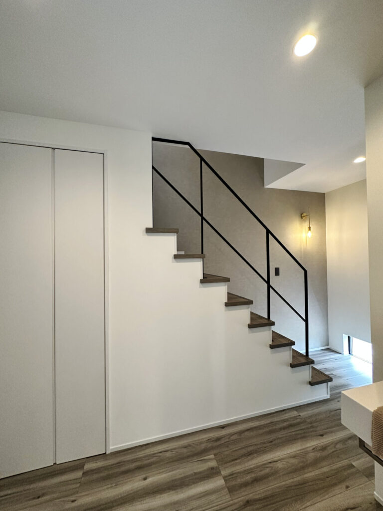 近年は、デザイン性の高いストリップ階段(蹴込み板のない抜け感のある階段)や、スケルトン階段なども人気。家族の動きが見えやすく、開放的な印象になります。