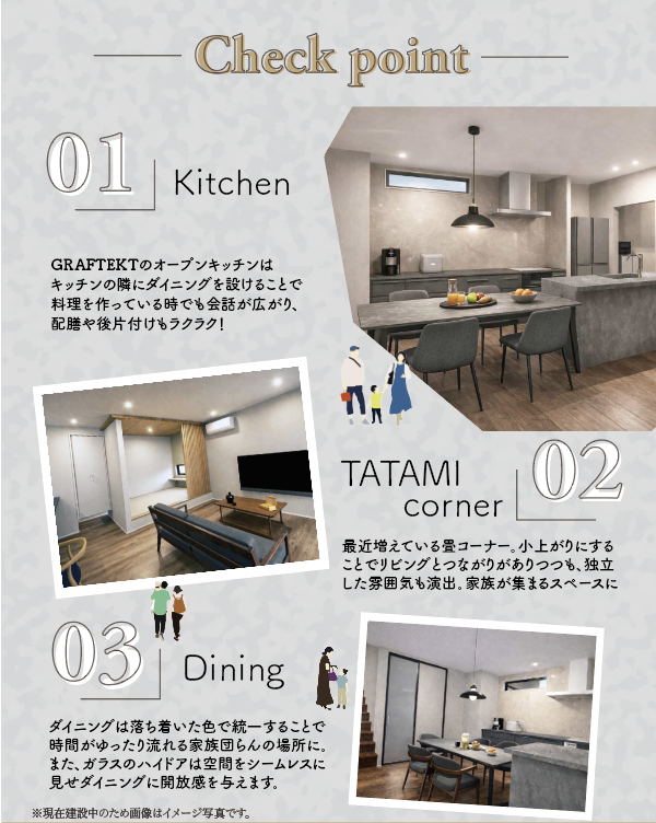 ●畳コーナー最近増えている畳コーナー。リビングとつながりがありつつも、小上がりにすることで独立した雰囲気も演出。家族が集まるスペースに