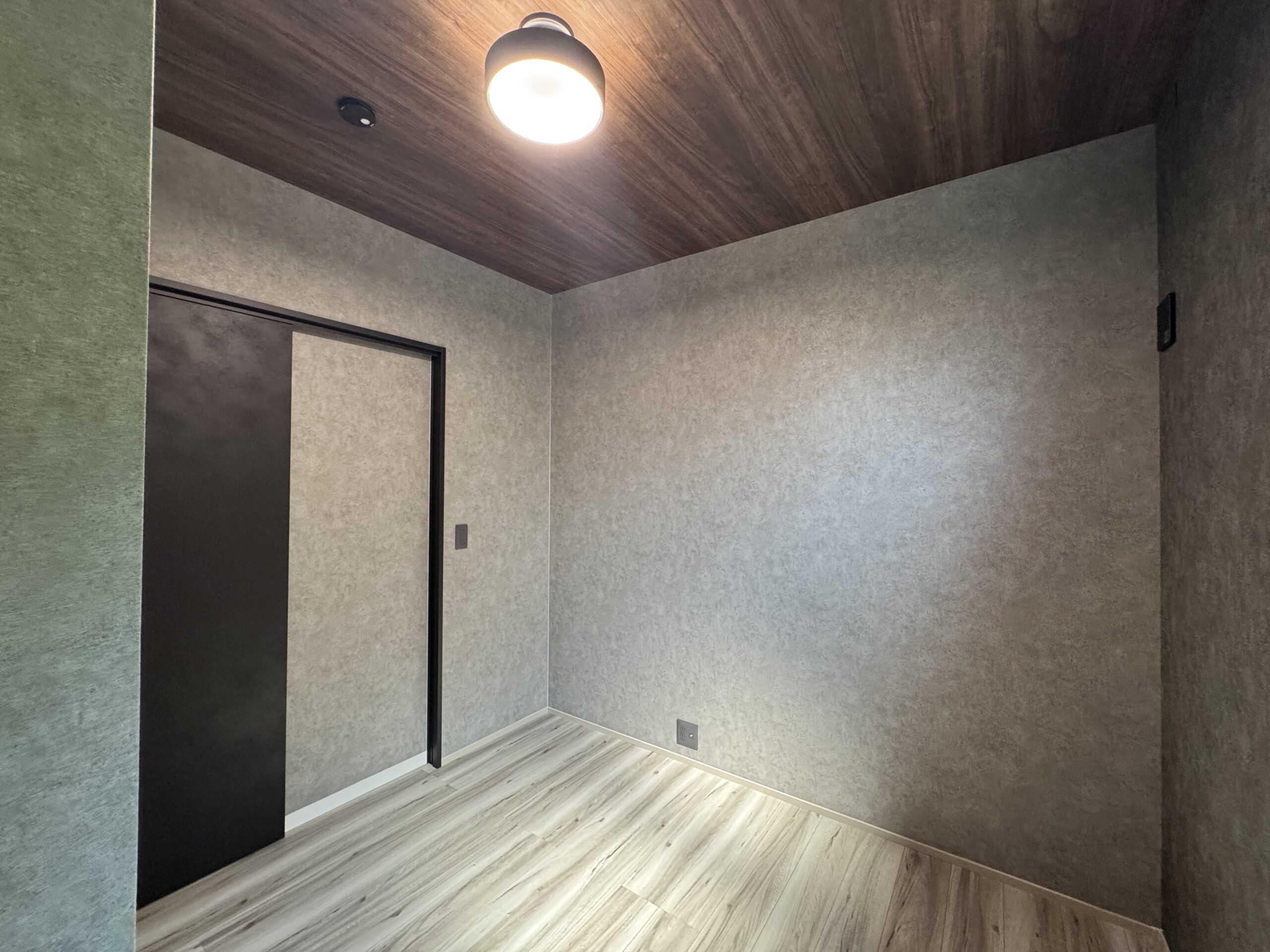 グレージュっぽい雰囲気がある和洋折衷の和室。扉も収納の建具も全てグレーにして、おしゃれながらも落ち着く色合いの和室に仕上がっています。