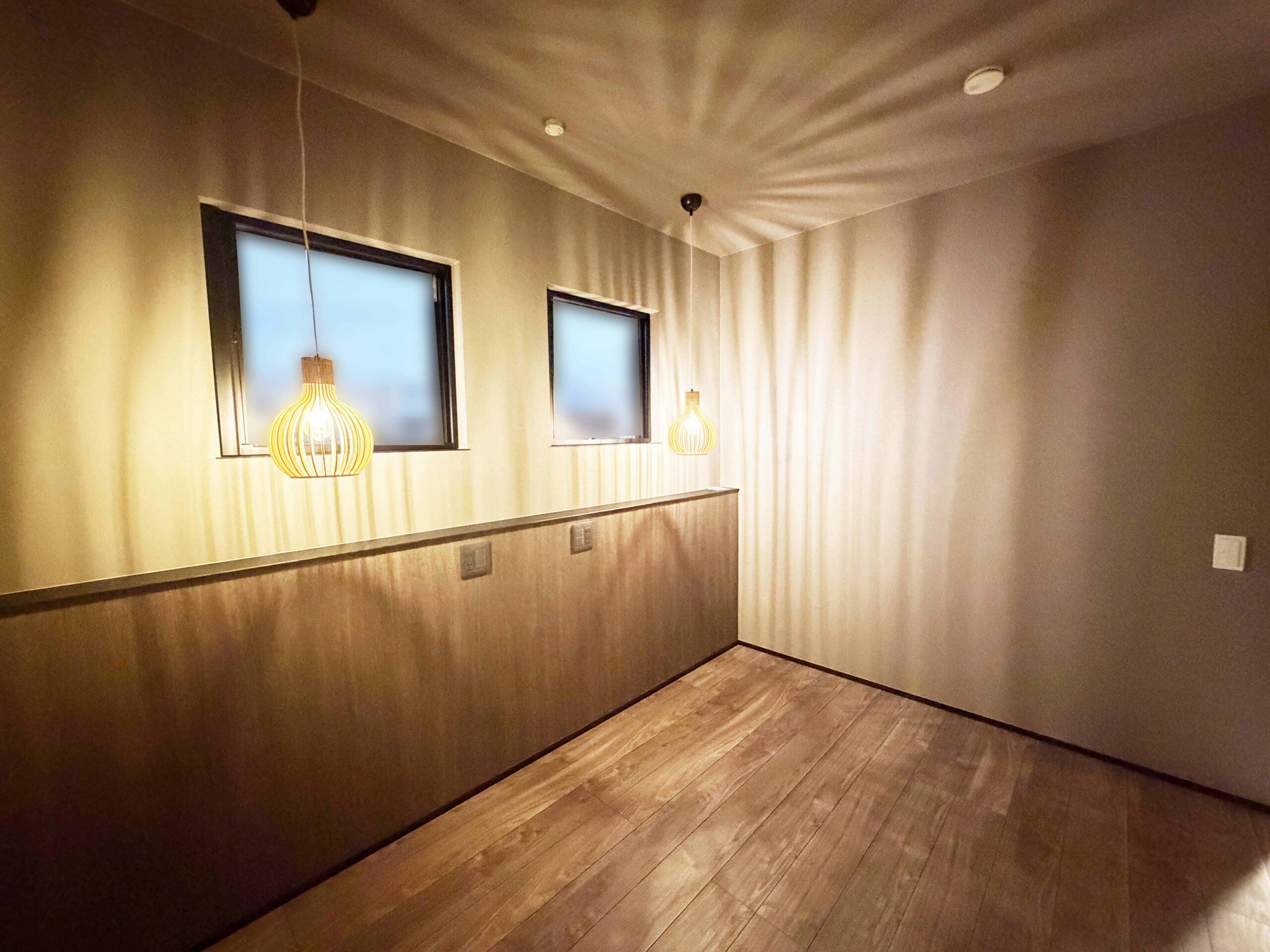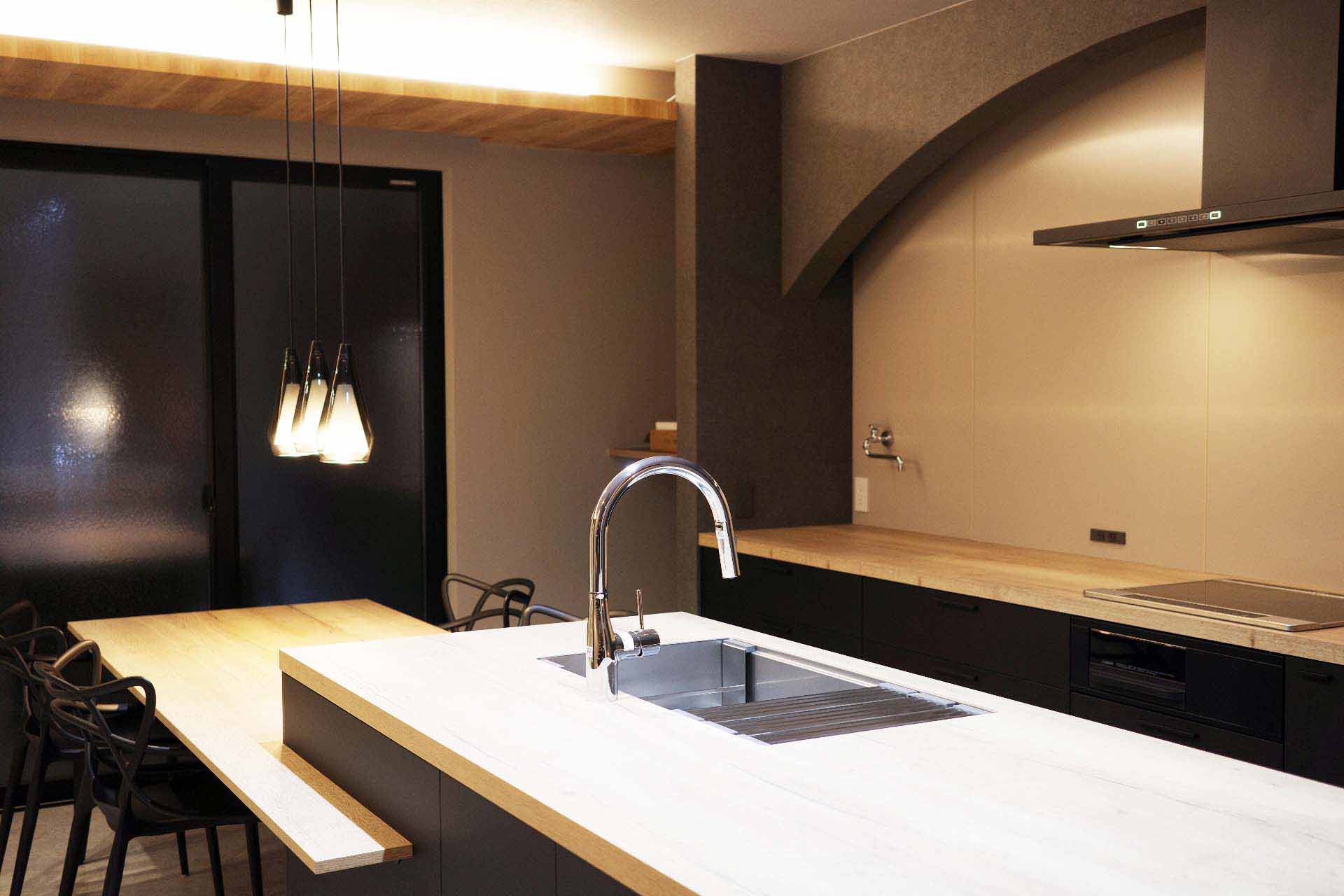 あたたかみのある照明で照らされているモダンなキッチンに仕上がっています