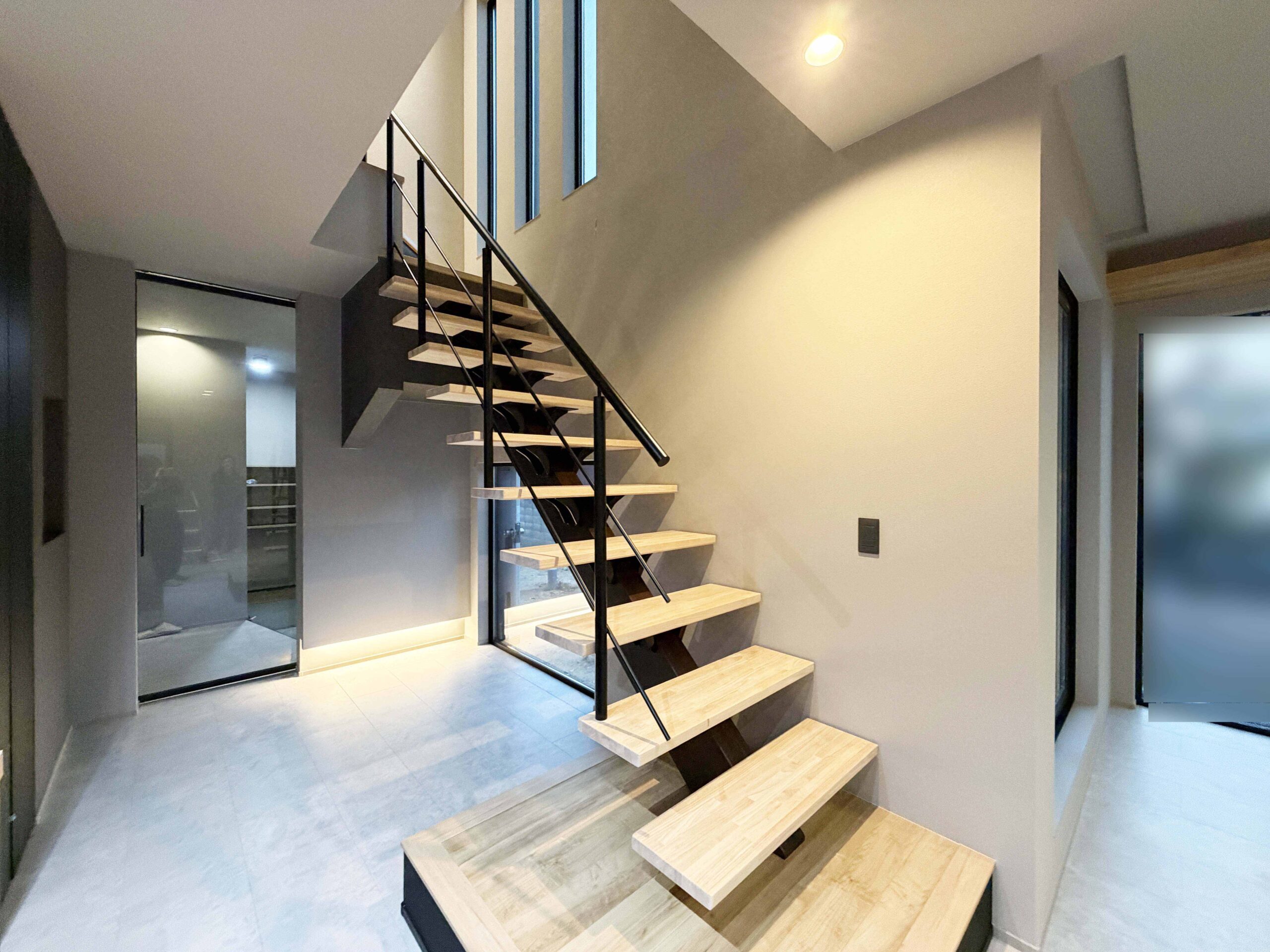 木と黒のアイアンの黄金比のスケルトン階段は空間に抜け感を演出してくれます。